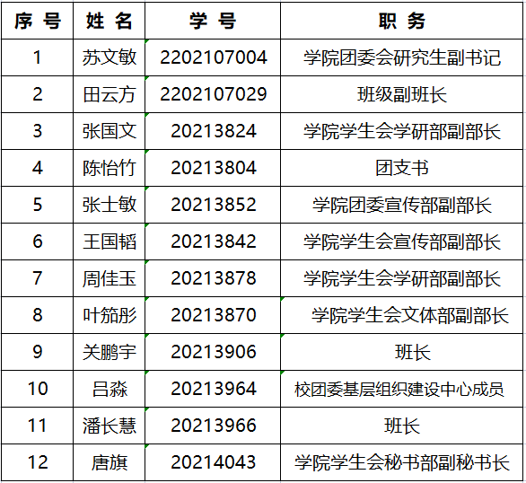为了认真贯彻党的发展党员工作方针,充分发扬民主,增加发展党员工作的透明度,把好发展党员质量关,确保新党员质量,经本学院党委研究,现将已列入2023年度发展计划,且通过党支部民主测评的发展对象在全院范围内公示。公示时间为5个工作日(2023年5月29日至2023年6月2日)。在公示期内,党内外群众如对发展对象有意见,请以真实单位、姓名,用书面、电话等形式如实反映情况。群众反映的问题可受到法律保护,我们将严格保密。