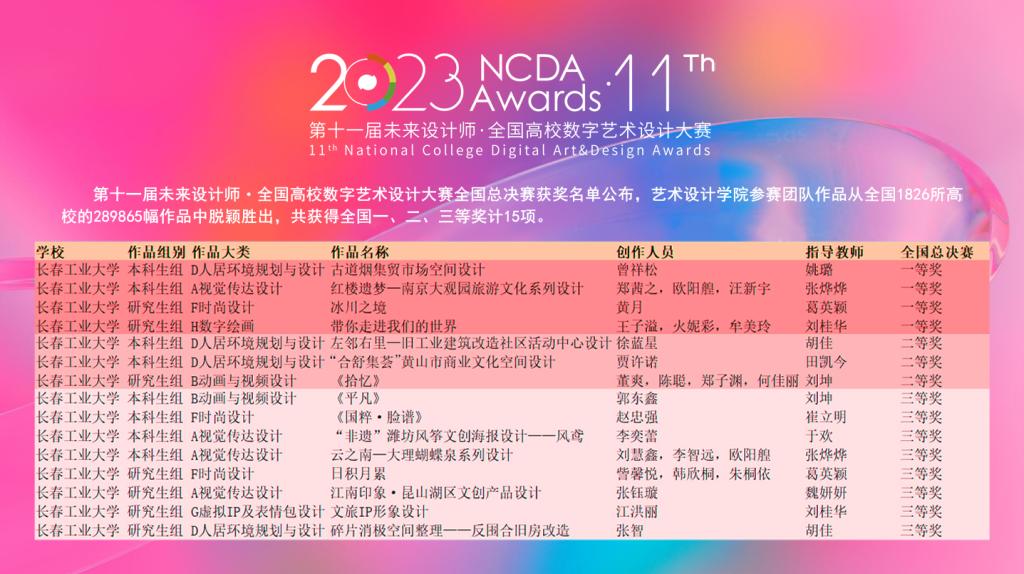 新闻网讯(通讯员 刘桂华)8月25日,第十一届未来设计师•全国高校数字艺术设计大赛(简称NCDA大赛)国赛获奖名单公布,我院共获国家级奖项15项,其中一等奖4项、二等奖3项、三等奖8项;3人获全国优秀组织教师,4人获全国优秀指导教师。