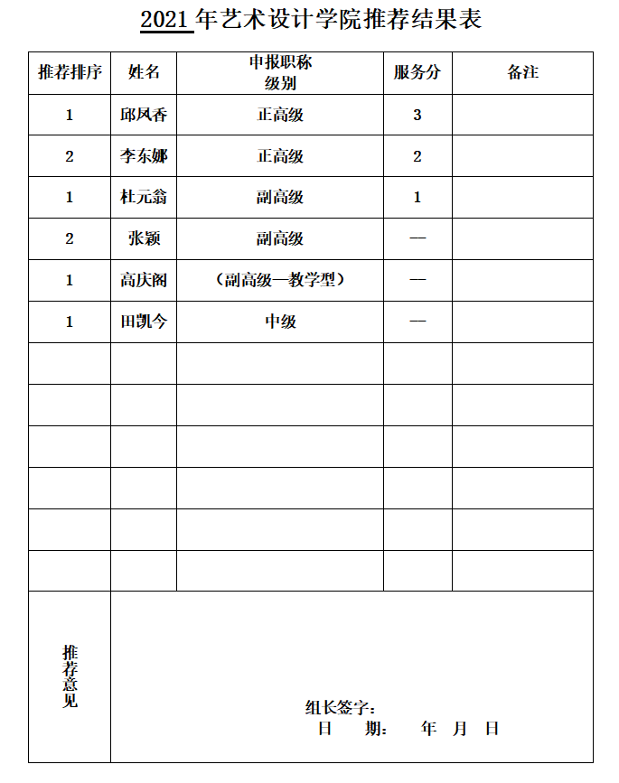 各级别参评人员的推荐排序结果如下,见推荐结果表。