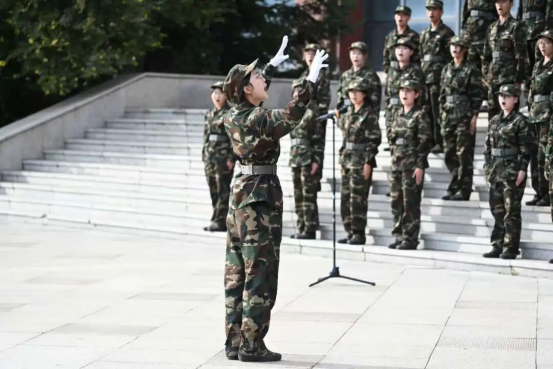 在雄壮的歌声中,全体新生坚定的信念瞬间定格成永恒。阶梯上,迷彩与蓝天同框。男低音声部和女高音声部和谐悠扬,鼓点落下,全员踏步成阵,观众席瞬间被震撼。