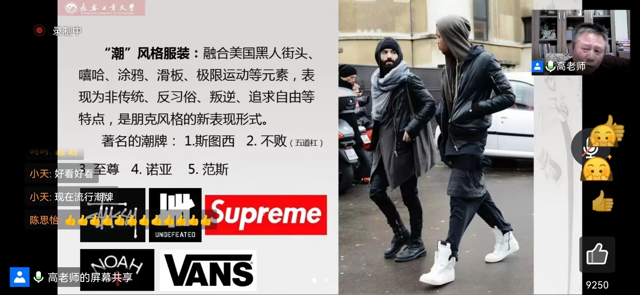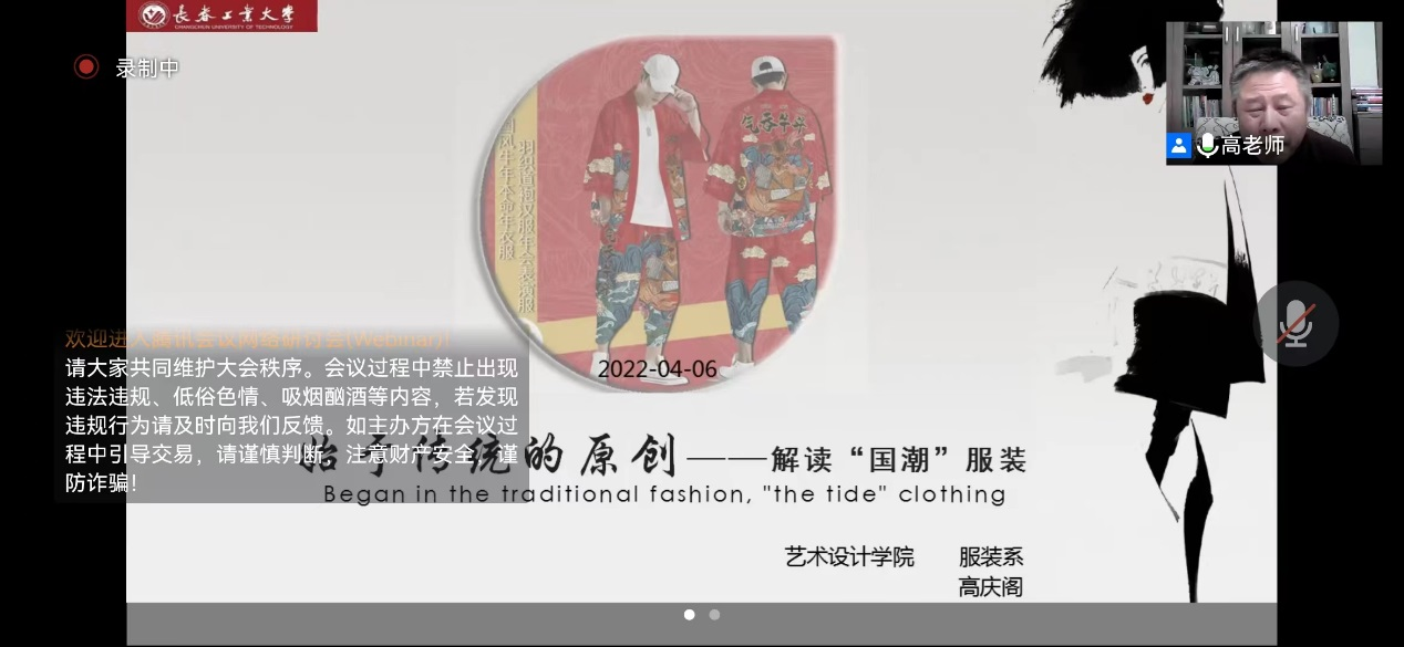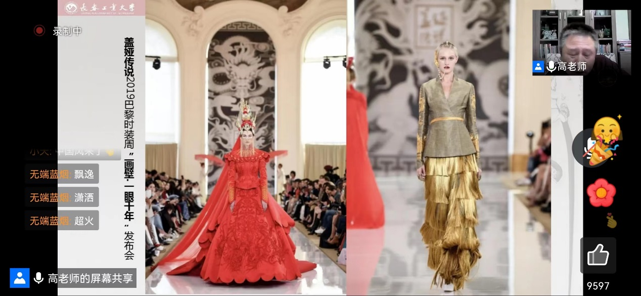 4月6日晚19:00时,第六讲《始于传统的原创——解读“国潮”服装》由艺术设计学院教师高庆阁老师主讲。云端200余人共同观看讲座,高庆阁老师从“国潮”的定义、缘起、发展入手,通过品牌发布会和成衣风格进一步解读 “国潮”在当今世界时尚圈发挥的重要作品。讲座现场热烈,受到广大师生的好评。