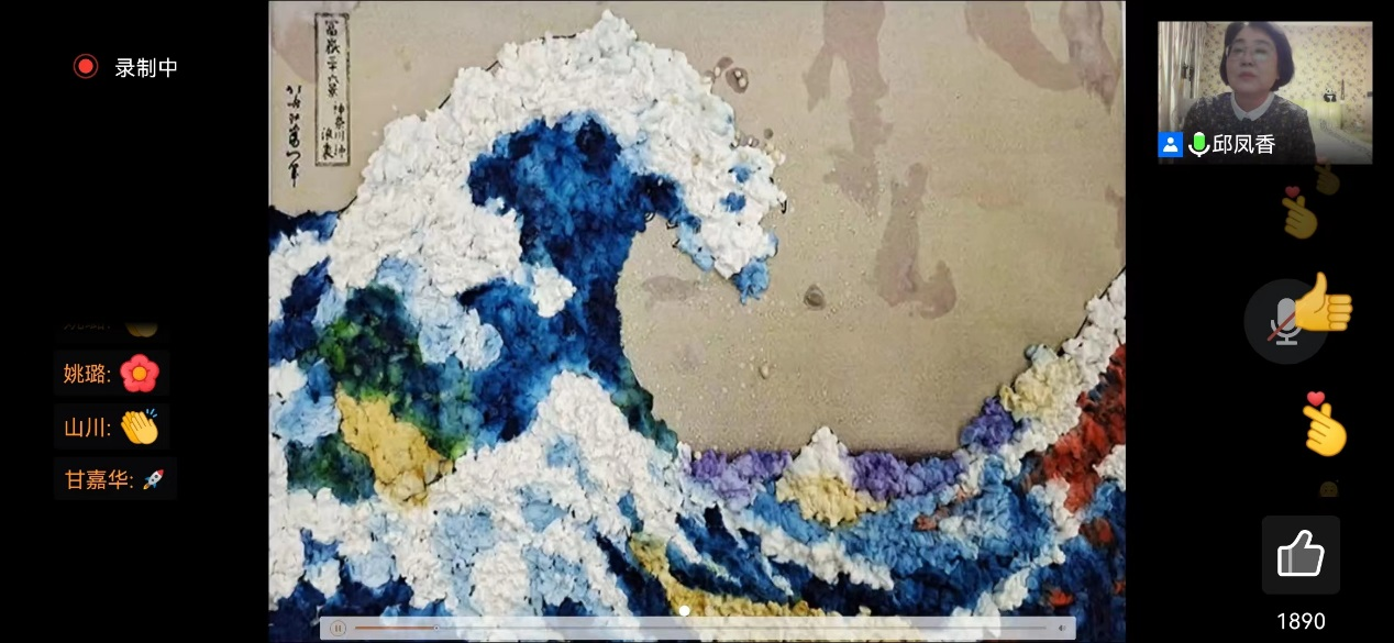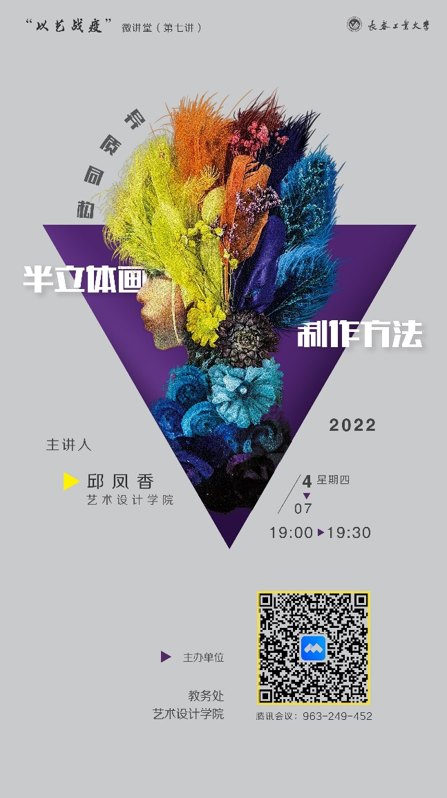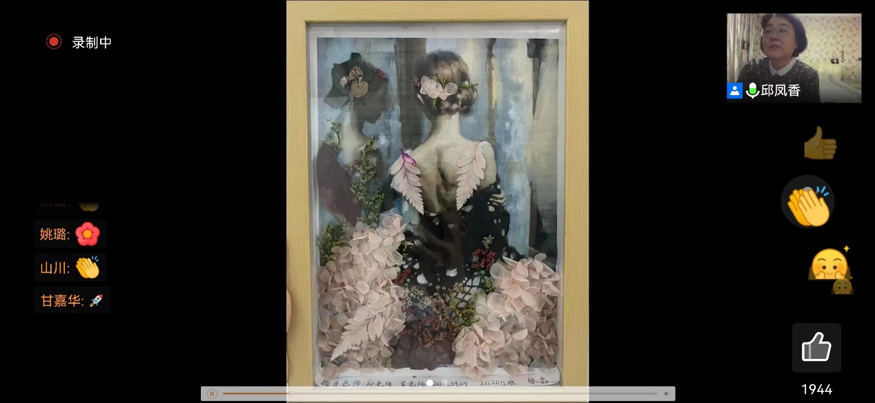 4月7日晚19:00时,第七讲《异质同构半立体画制作方法》由艺术设计学院邱凤香老师主讲。邱凤香老师以异质同构半立体画作品云展览开篇,介绍了异质同构的原理以及画面处理中需要注意的色调、突出主体形象等问题。最后以视频演示的形式完成了一幅精品画作。