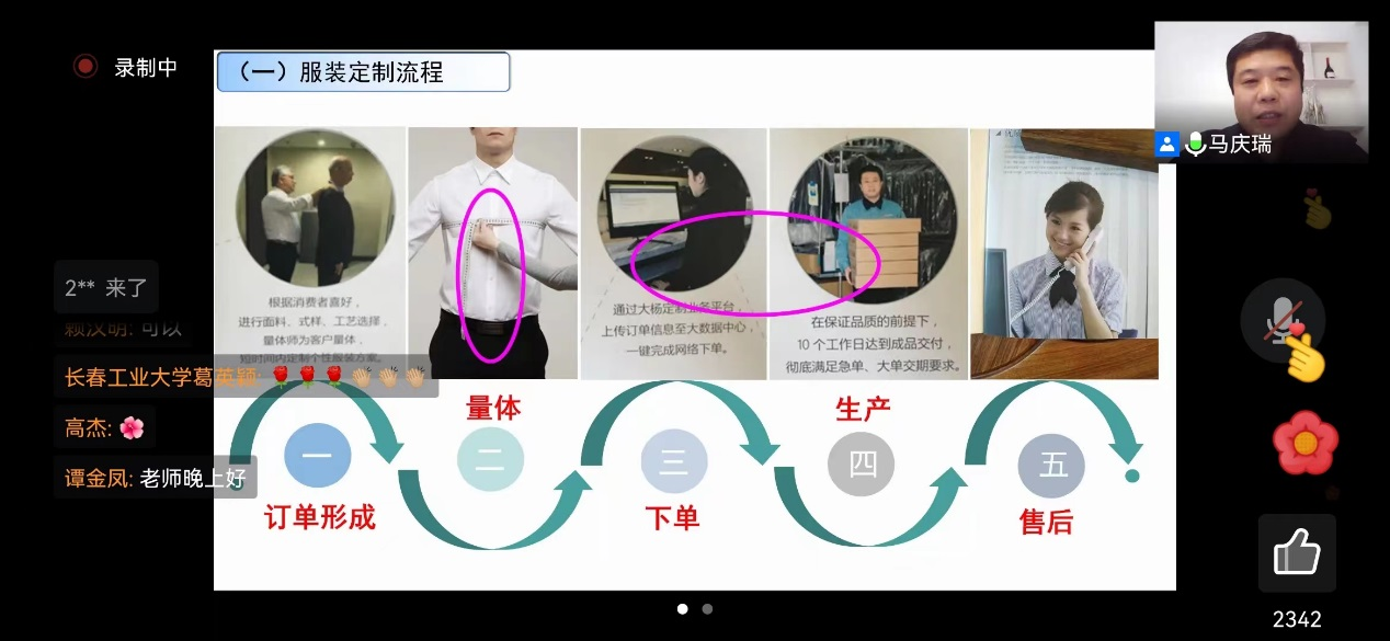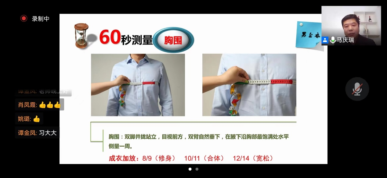 4月8日晚19:00时,第八讲《服装产业的智能化与高级服装定制》由艺术设计学院马庆瑞老师主讲。马庆瑞老师解读了高级服装定制的流程,并亲自操作在成衣定制网站怎样定制成衣。以短片视频形式演示测量身体各部位时需要注意的问题,同学们普遍反映通过马老师的讲授避免了自己上网选购成衣会出现的误区。