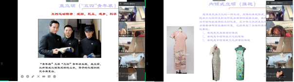 在授课过程中以中华立领为例,积极开展思政教育:通过讲解“五四”青年学生装,引入“五四运动”积极引导学生立志高远,脚踏实地。弘扬爱国、进步、民主、科学的伟大五四精神,爱国主义是我们民族精神的核心,是中华民族团结奋斗、自强不息的精神纽带。同时又以旗袍领为例深入挖掘服装的文化内涵、寻求文化底蕴,形成了稳健持重的特点,突出国人精神气质,增强学生的仪态仪表教育。